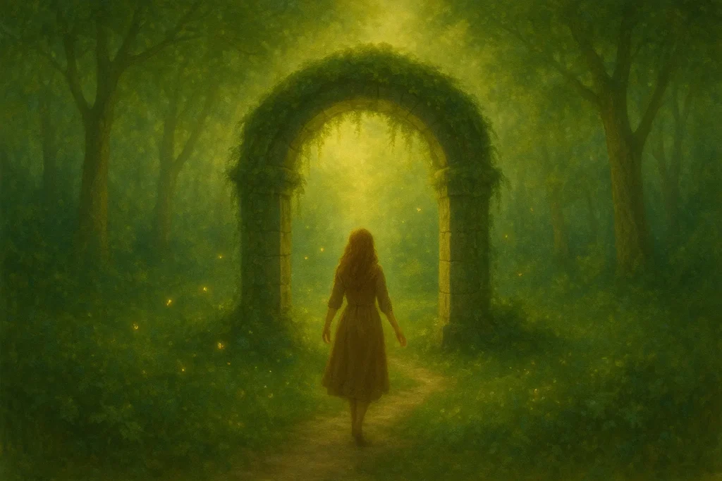 Allí vivía una joven llamada Lira. Desde pequeña sentía que su vida estaba hecha de prisas, preocupaciones y palabras que no decían lo que su corazón anhelaba. Un día, cansada de sentirse desconectada, siguió la intuición de su respiración y se adentró en el bosque. Tras horas de andar, encontró un arco de piedra cubierto de musgo con una inscripción: